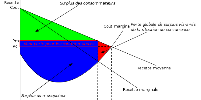 Avec la situation de monopole, l’entreprise est price-maker et peut ainsi se permettre de proposer un prix plus élevé. Ce qui engendre un surplus moins élevé pour les consommateurs. L’entreprise en situation de monopole va pouvoir, par contre, profiter d’un surplus plus important. Mais comme le montre le graphique, cela engendre une perte sèche, ce qui permet de dire que le monopole est sous-optimal dans son ensemble.